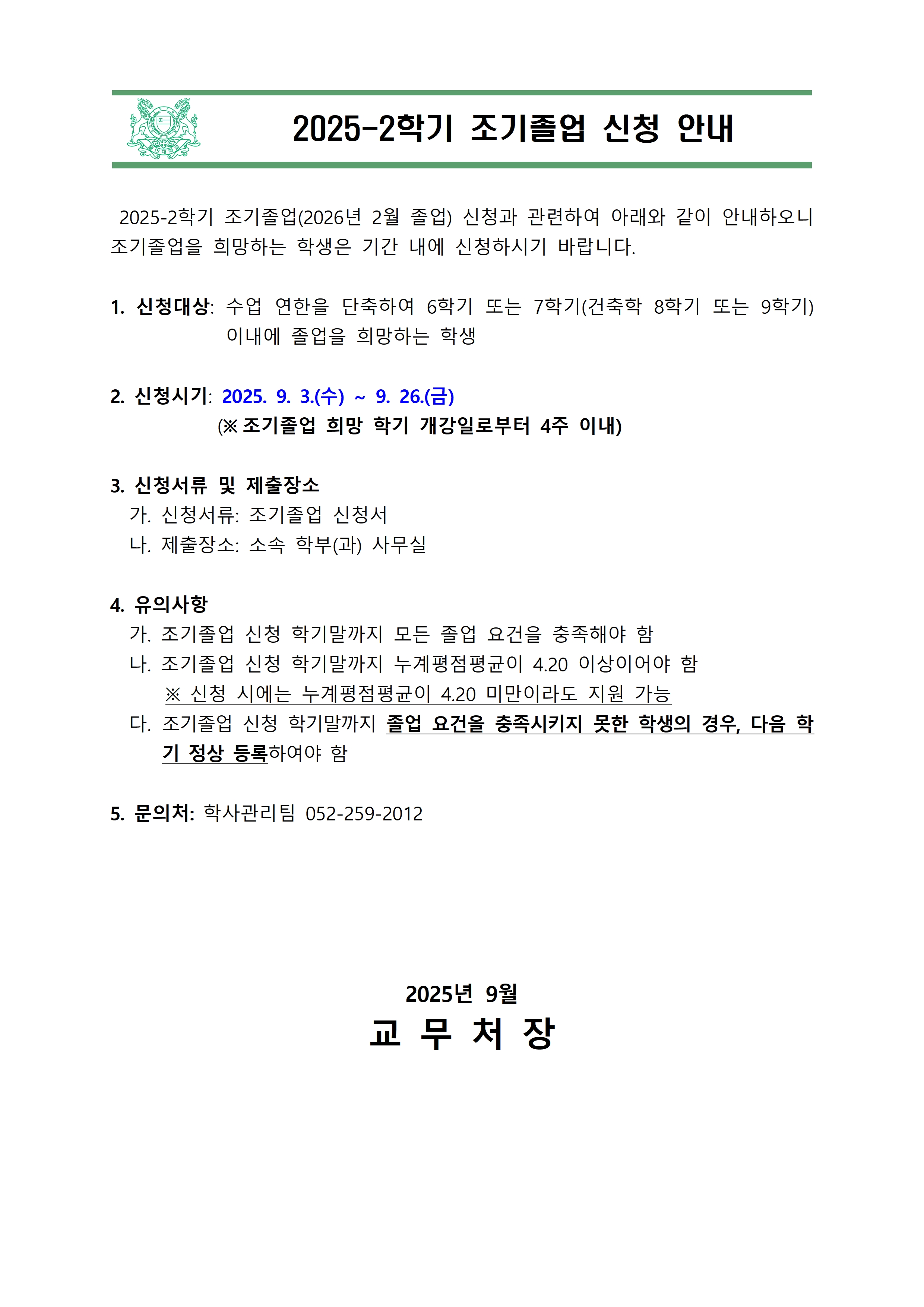 [학사] 2025-2학기 조기졸업(2026년 2월 졸업)신청 안내