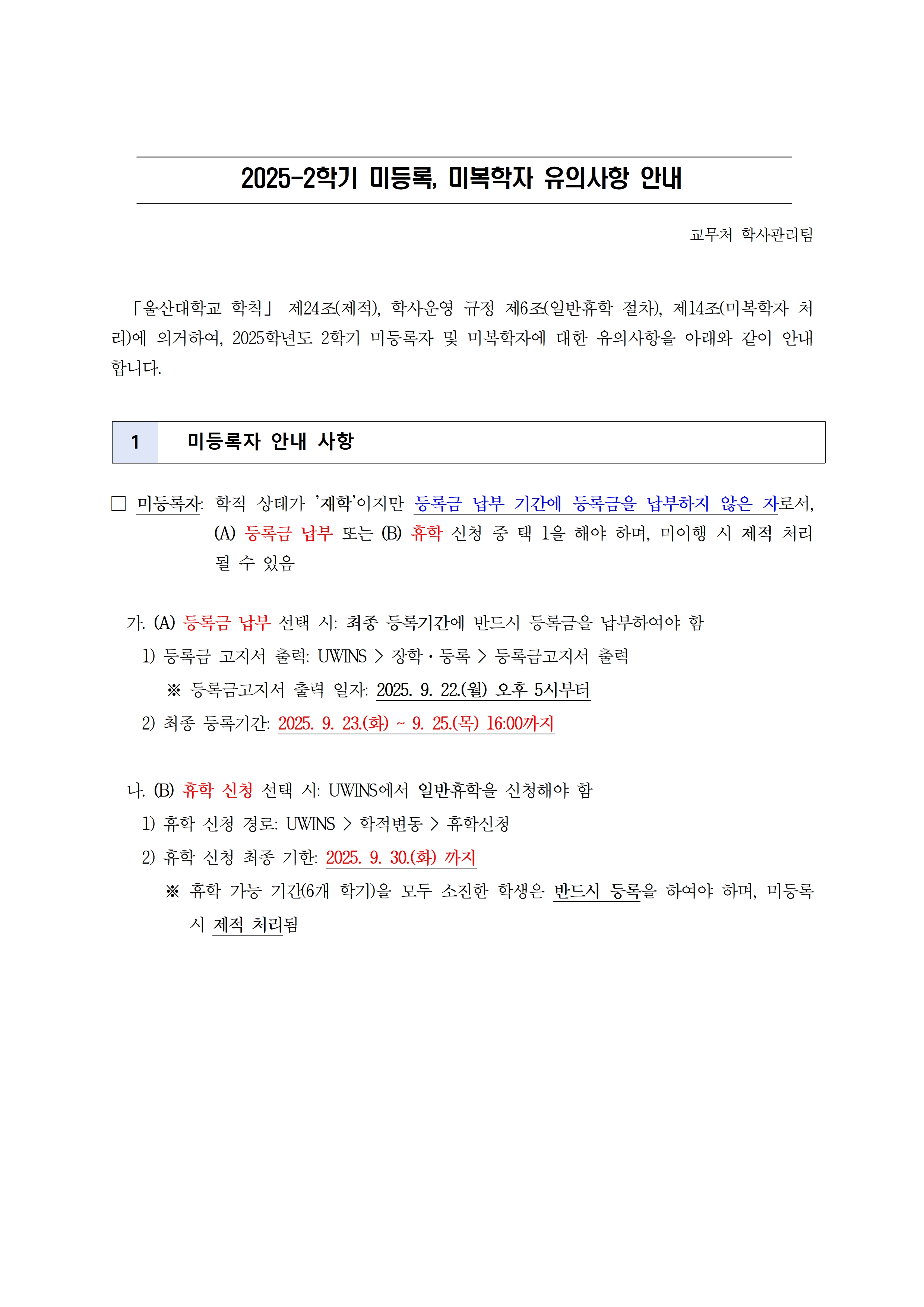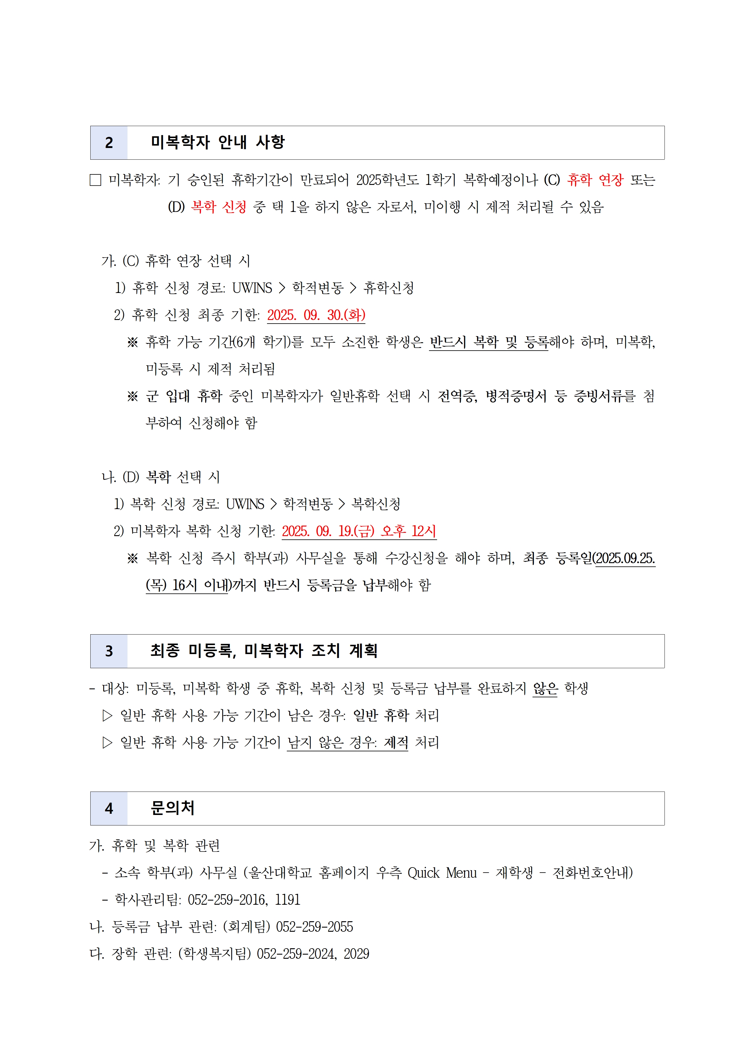 [학사]2025-2학기 미등록, 미복학자 유의사항 안내