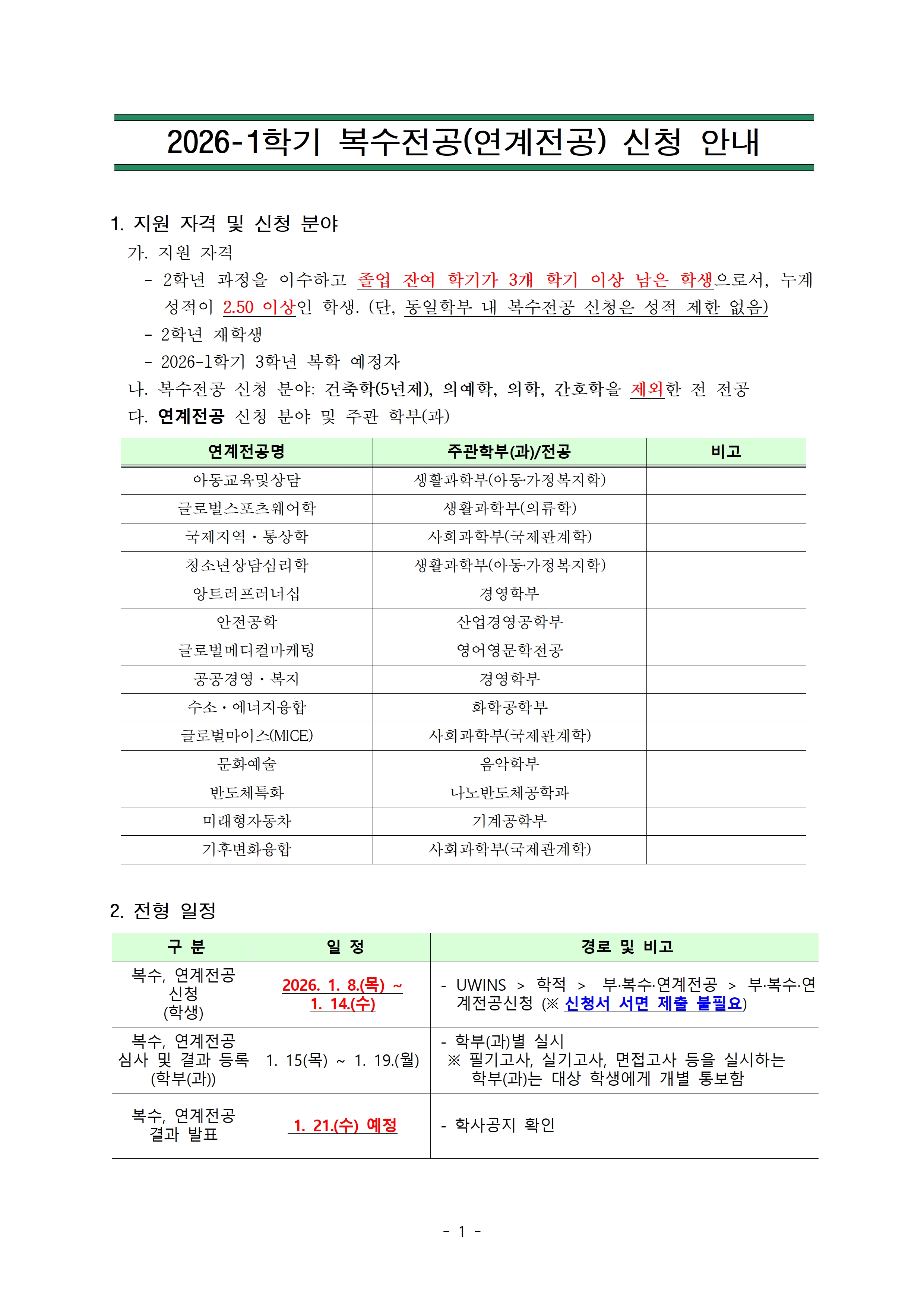 [학사]2026-1학기 복수(연계)전공 신청 안내